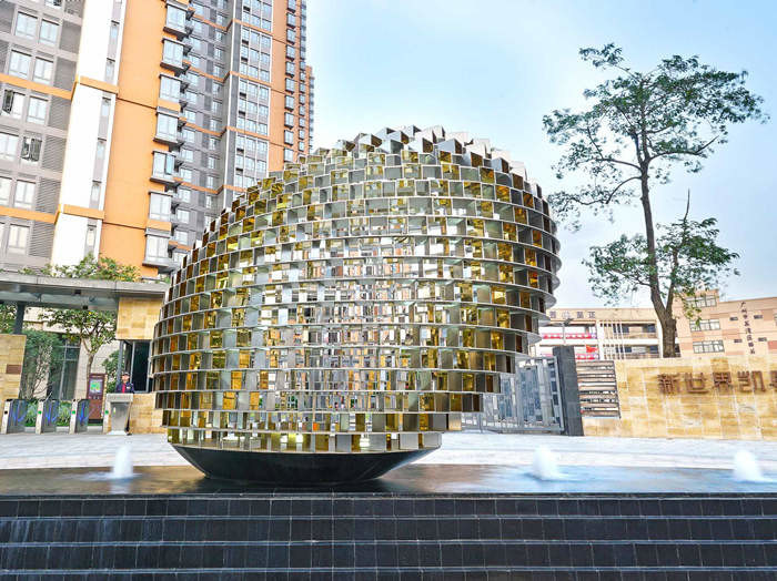 Dieses höhlte heraus Ei formte Spiegeledelstahlskulptur ist installiert am Eingang einer hochwertigen Gemeinschaft aus. Die Kreisskulptur ist wie das Nest eines Vogels, das zurückgehendes Haus bedeutet. Dieser Entwurf ist Spitzen- ikonenhaft, luxuriös und